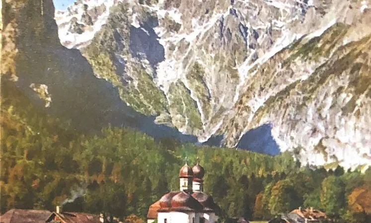 Im Hintergrund der Ansicht erhebt sich majestätisch der Weizmann, ein markanter Gipfel der Berchtesgadener Alpen, der die Szenerie landschaftlich eindrucksvoll ergänzt.